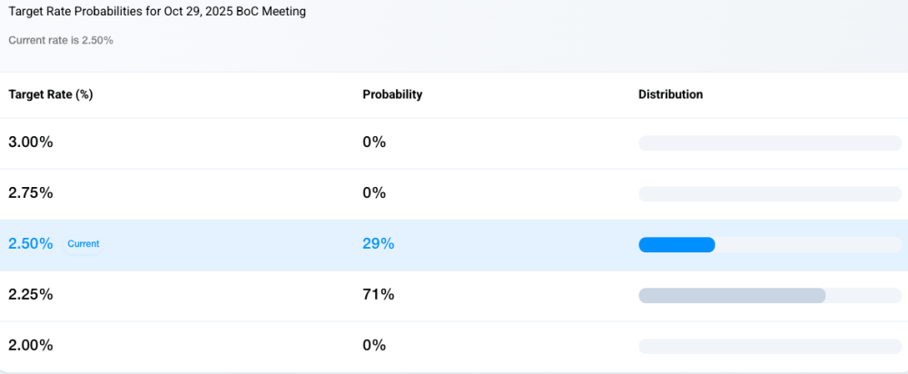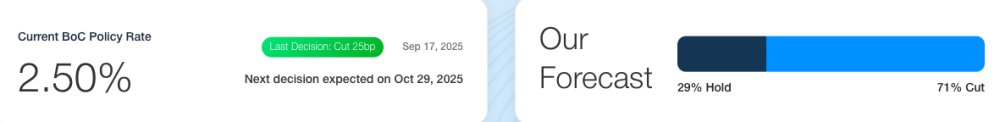As of late October, swaps and OIS market futures suggest roughly a three-in-four (≈77%) chance of a 25-bp cut at the October 29 meeting, according to BankofCanadaOdds.com. Analysts from RBC, BMO, and CIBC are divided. RBC expects one final trim to 2.25%, calling it the last step of the easing cycle, while CIBC believes weak housing and retail data could push another cut in December.