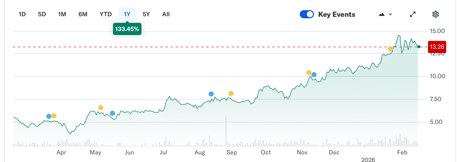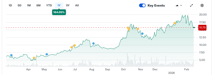 On February 15, 2026, the price of Ivanhoe Electric shares was approximately $15.79 per share, resulting in an intraday market capitalization of approximately $2.29 billion. Although the price of Ivanhoe Electric has experienced some volatility, it has remained above the multiple year lows.