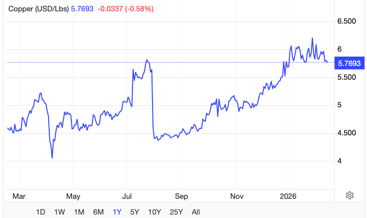 The price of copper as of February 15, 2026 was about $5.76/lb, which is approximately $11,520/mt, representing continuing strength of copper in spite of the fact that it has also had some short term price volatility in recent times.