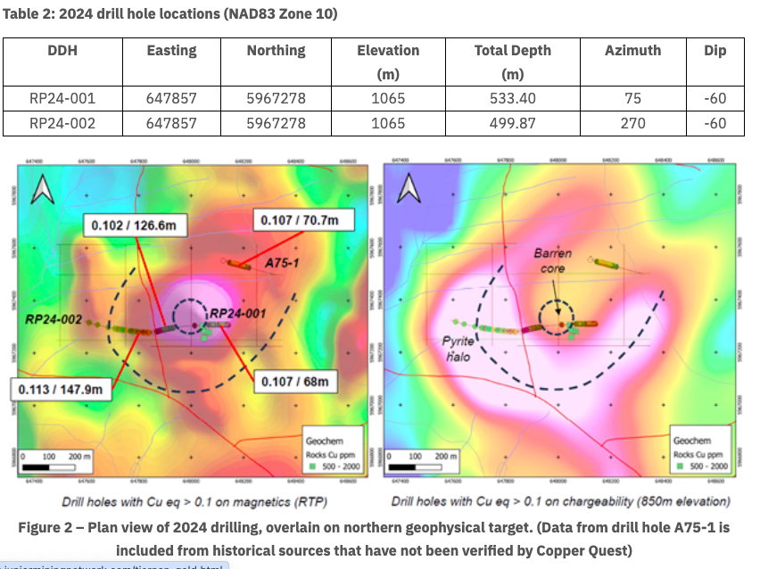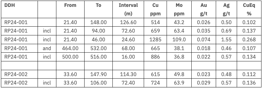 - RP24-001 returned 0.102% CuEq over 126.6 m from 21.4 m, including 0.268% CuEq over 24.6 m