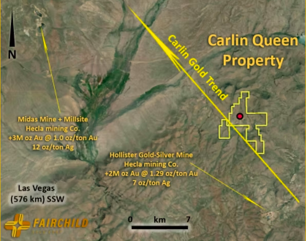 The Carlin Queen Project represents a more advanced exploration asset within Fairchild’s Nevada portfolio. It is located approximately 48 miles northwest of Elko, near the prolific Carlin and Midas gold trends.