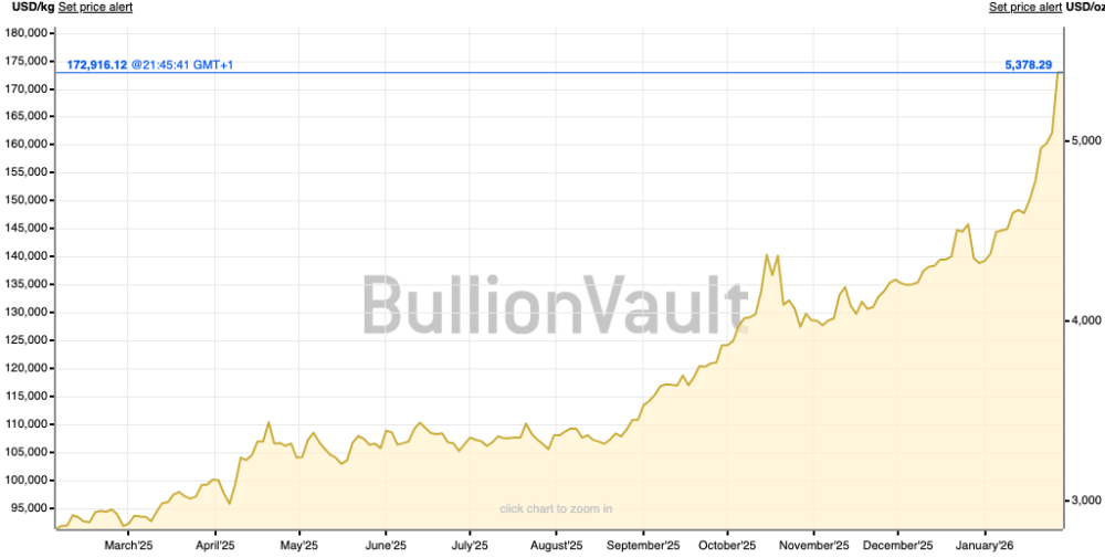 Gold is trading at an all-time-high of about $5,250-$5,350 an ounce based on data available from the world’s top bullion desks at the end of January 2026. The price has risen roughly 35-40 percent in the last 12 months; it is one of the best-performing major assets.