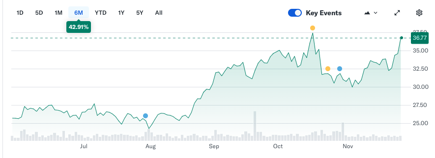 - Annual Dividend Forecast: $0.10 per share; representing a forward yield of approximately 0.25-0.30% at recent trading prices (Yahoo Finance)