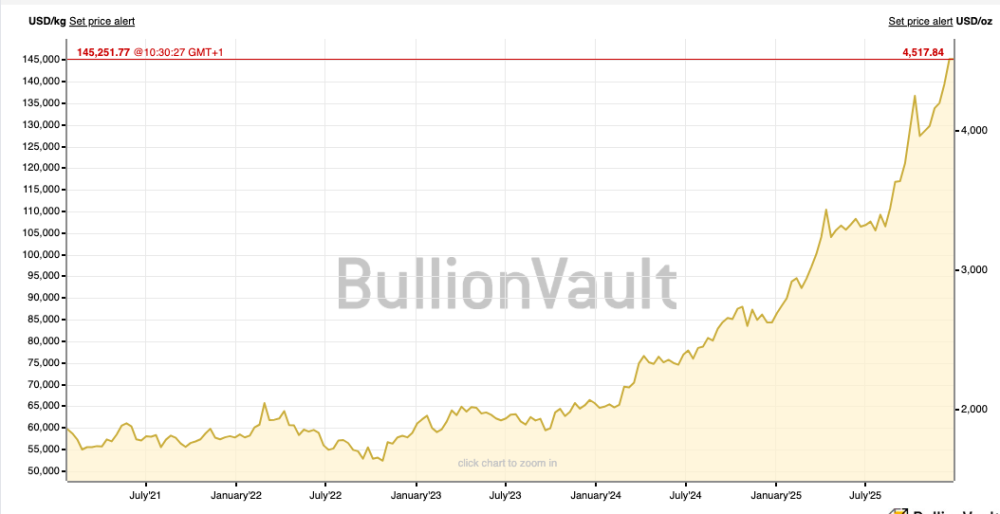 - Spot gold hit fresh record highs around US$4,500/oz on Dec 26, 2025 (spot quoted near US$4,501/oz, after a session peak around US$4,531/oz).