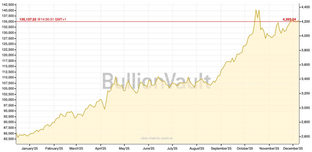 - Spot Gold Price: approximately US$4,213 per ounce (approximately US$135,439 per kilogram)