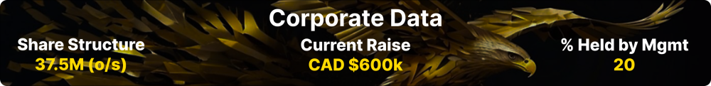 Golden Rapture has a total of 37,469,390 shares outstanding with a total of 54,809,790 fully diluted. Approximately 20 per cent is in the hands of management and insiders. By October 1, 2025, cash on hand of $350,000 had been recorded. A $600,000 financing has been arranged for 4.6 cents per share, with five cent warrants, expiring in 24 months. Proceeds will be applied to Hutchison and Bull Boy exploration, working capital and a $100,000 marketing effort.